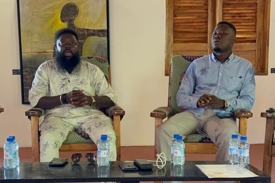 De gauche à droite, Éric Mèdéda, coordonnateur du collectif Sac O Dos et Jeff Éric Atchado, historien de l'art lors du talk au Petit musée Villa Karo à Grand-Popo